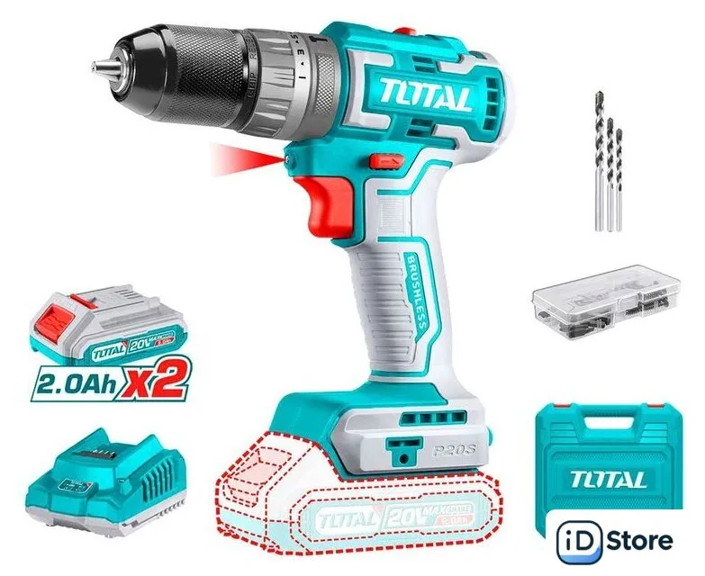 Ударная дрель-шуруповерт Total TIDLI20508 (с 2-мя АКБ, кейс, набор оснастки)