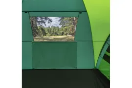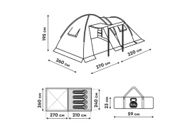 Палатка RSP House 4 рассчитана на размещение четырех человек и предназначена для продолжительного отдыха на природе с высоким уровнем комфорта. Конструкция включает просторный тамбур площадью 7 квадратных метров и высотой потолка 190 см, в котором можно организовать кухню-столовую или хранить вещи. Спальня выполнена по туннельному типу для увеличения внутреннего пространства, а тамбур имеет купольную конструкцию, обеспечивающую прочность и устойчивость.