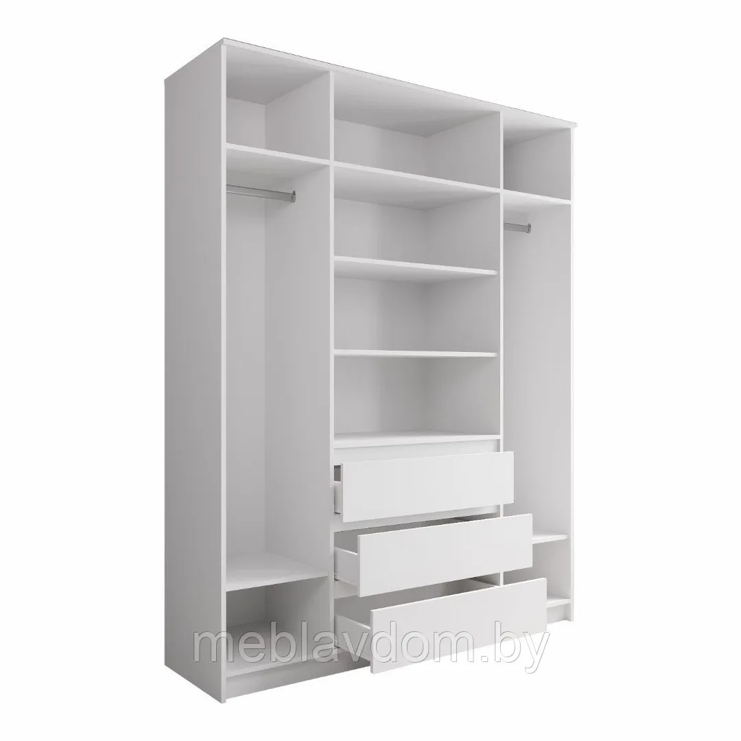 Очень удобный трехстворчатый шкаф для одежды имеет три отделения. Полки и штанга, внизу выдвижные ящики. Оптимальное решение для любого посещения.
