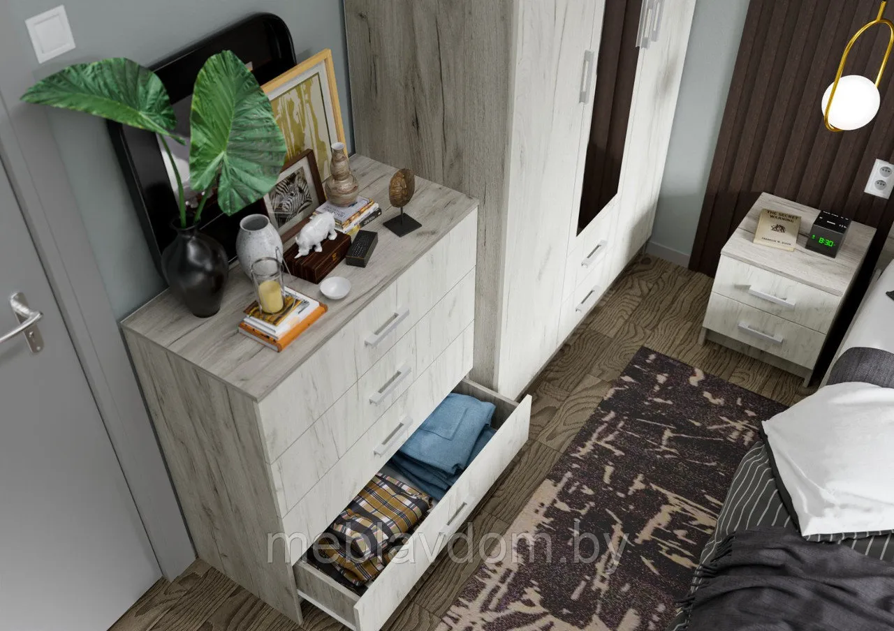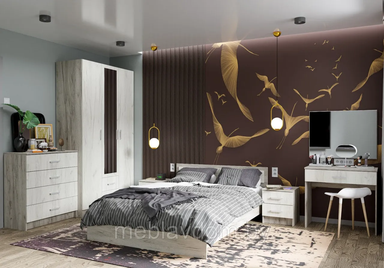 Спальня «Гармония» — это гармоничное сочетание мебельных элементов, которое не только помогает подобрать модули, идеально подходящие друг другу, но и создает уют и комфорт в вашем интерьере. Центральным элементом этой спальни является просторная двуспальная кровать с декоративным изголовьем. Удобство комплекта также обеспечивается прикроватными тумбами с выдвижными ящиками, где можно хранить все необходимые вещи и мелочи под рукой. Для удобства хранения одежды и постельного белья идеально подойдут распашной шкаф с зеркалом и комод. Этот набор не только поддерживает порядок в комнате, но и визуально увеличивает пространство. Завершающим и приятным дополнением для каждой женщины является трельяжный стол с зеркалом, где она сможет разместить косметические принадлежности и наносить макияж.