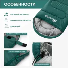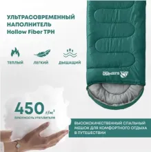Внешняя ткань — Polyester Rip Stop 210T 68D с водоотталкивающей пропиткой: прочная, износостойкая, но мягкая, защищает от влаги, например от конденсата в палатке. Подкладка — дышащий Polycotton T/R 88X64 с добавлением хлопка: легкая, приятная на ощупь, с высокой паропроницаемостью, эффективно отводит влагу от тела. Утеплитель Hollow Fiber TPH собственной разработки содержит волокна с микроскопическими порами, которые создают дополнительные воздушные камеры — это обеспечивает высокую теплоизоляцию при небольшом весе. Упругие волокна быстро расправляются после распаковки, придавая спальнику объем и мягкость.